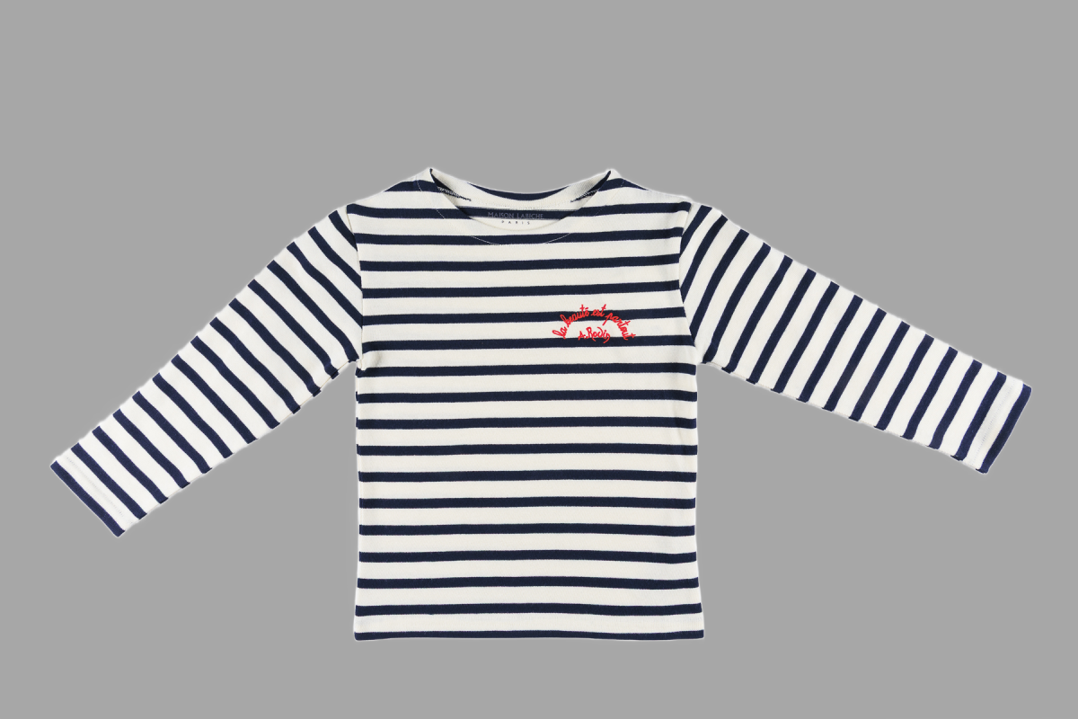 Notre marinière présente une coupe droite, une encolure bateau, ainsi qu’une finition des manches et du bas du corps en double aiguille. Elle est confectionnée dans une maille épaisse et très confortable.